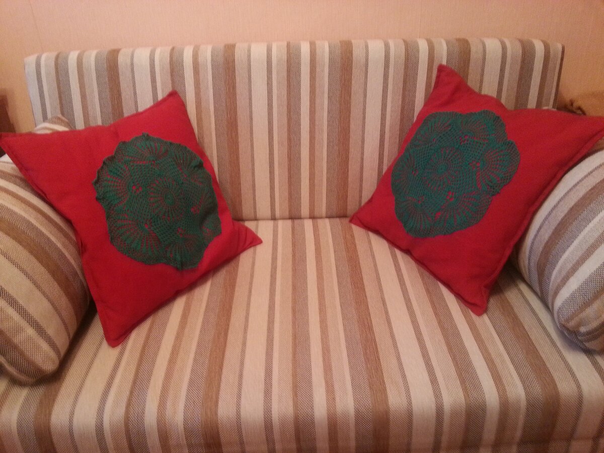 Украшение дома декоративными подушками- модный тренд. Каких только подушек не бывает. Вполне понятна такая их популярность, ведь с помощью декоративных подушек можно легко без особых усилий и затрат изменить настроение помещения. Добавить уютные нотки или цветовые акценты. Отличная идея - сделать для диванных подушек сезонную "одёжку" и менять её в зависимости от времени года. Предлагаю, как простую поделку, зимний вариант диванной подушки. Я взяла готовые наволочки и украсила их связанными крючком салфетками . Быстро и просто! Думаю, интересно использовать одинаковые салфетки - комплекты всегда смотрятся гармонично. Также полезно применять контрастные цвета, тогда салфетки в оформлении изделия будут выглядеть современно. Когда зимний сезон закончится, не сложно будет убрать такие наволочки, заменив их весенним вариантом - и Вы снова обновите внешний вид комнаты. * Эта поделка подойдет, как идея для подарка. * В процессе создания