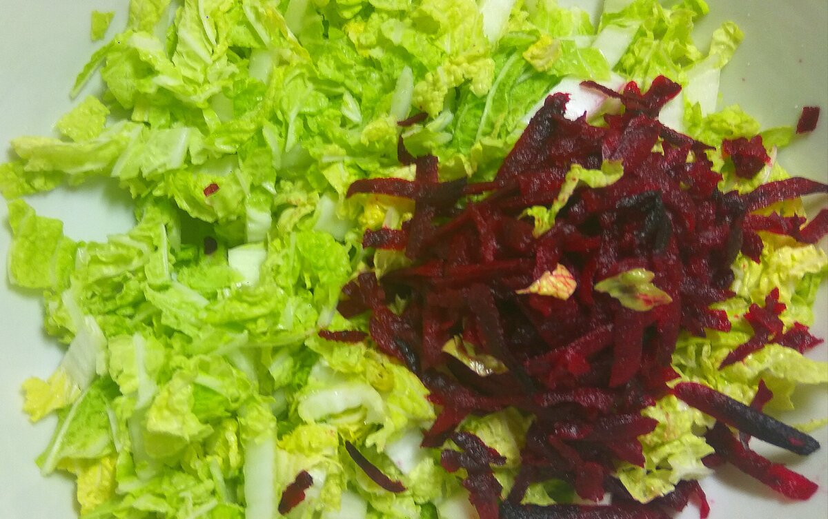 1) Сначала шинкуем капусту или салат и слегка мнем в блюде, посыпав солью.