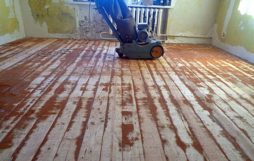 Сначала от владельца требуется избавиться от изношенного слоя дерева. Для этого используют шлифовальную маш