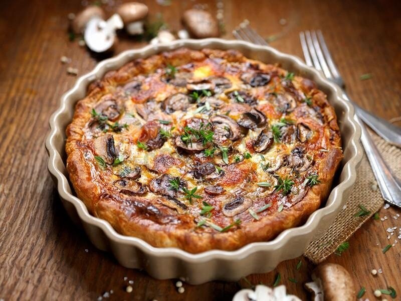 Простой пирог идеально подходит для семейного ужина! Готовится легко и быстро, а начинки можно варьировать. Грибы с курицей — классическое беспроигрышное сочетание. Ингредиенты: Грибы : 200 гр, Филе куриное : 1 шт, Лук репчатый : 1 шт, Яйцо : 5 шт, Майонез : 250 гр, Мука : 5 ст. л., Сода : 1 ч.л. (гашеная уксусом), Масло растительное : для жарки, Перец черный молотый : по вкусу, Соль: по вкусу Приготовление: 1. Растительное масло налить на сковороду. Раскалить. 2. Репчатый лук очистить, нарезать кубиками. Обжарить, пока не станет прозрачным. 3. Грибы промыть и нарезать кубиками, отправить в сковороду к луку и жарить ещё 5-10 минут. 4. Куриное филе порезать мелкими кубиками. 5. Когда из сковороды выпарится лишняя влага от грибов, отправить в сковороду мясо. Обжаривать, пока кусочки мяса не посветлеют. Добавить соль и перец. Оставить остывать. 6. Приготовить тесто. В большой миске разбить яйца вилкой. Добавить майонез и сметану, всё хорошо размешать. В ту же миску пересыпать муку, доб