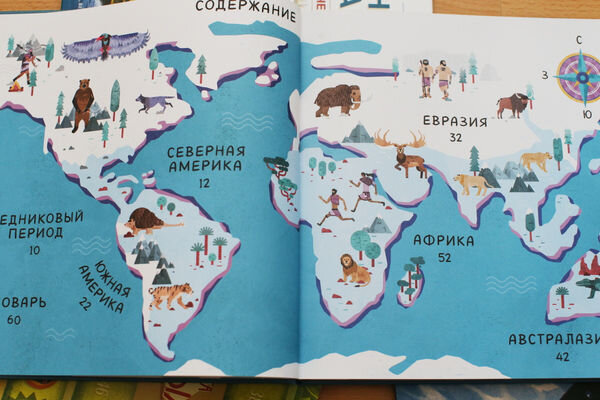 Это очень красивая книга с подробной, хорошо структурированной информацией, животные расположены по континентам. Но и континенты здесь - не совсем то, что мы знаем, потому что это древние континенты (Австралазия, Евразия, Африка, Северная и Южная Америка). Вы познакомитесь со многими животными, о которых даже не слышали (тераторн, гигантский олень, гигантский ленивец, длинная лама, сумчатый лев и многие другие), и информация здесь вовсе не примитивная, поэтому книга подойдет и для подготовки рефератов. Из "знакомцев" - мамонты, смилодоны, но и о них вы тоже узнаете много нового. Также имеется информация и о неандертальцах, о жизни первых людей. Картина мира доисторической эпохи с иллюстрациями, которые будоражат воображение. Хит для семейного чтения