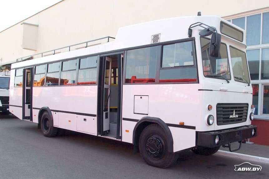 Кузов для данной модели на МАЗе "сваяли", что называется, на все выделенные деньги - оригинальный, но предельно простой (даже без двери для водителя). Плоское ветровое стекло, состоящее из двух частей, мощный передний бампер (кстати, от внедорожника МАЗ-6317) и грузовая платформа на крыше добавляли архаичности внешнему облику, но все это делалось по требованию заказчика.