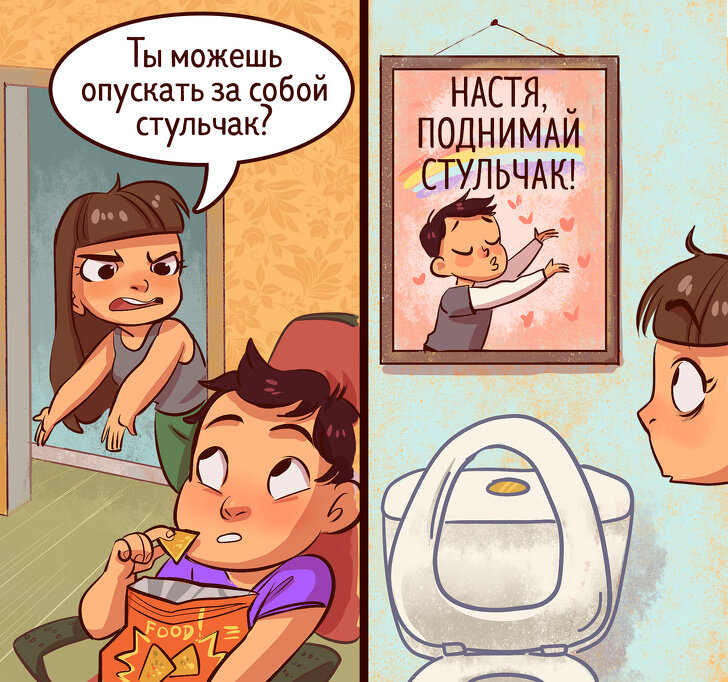 1. Не опущенный стульчак унитаза Заходишь в ванную комнату, а там — не опущенный стульчак. Ну как тут не взбеситься?! И все: крик, скандал и мир катится в пропасть. В то время как мужчина вообще не понимает, в чем проблема и почему так сложно просто взять и опустить стульчак унитаза. Он же его постоянно поднимает и не жалуется. 2. Кто будет мыть посуду? Ужинали вместе в любви и согласии, и все было хорошо до того момента, пока не пришло время мыть посуду. Мужчина рвется быстрее к дивану, ведь там как раз начинается футбольный матч, а женщина негодует, что и так у плиты весь вечер и тоже имеет право расслабиться и почитать книгу, например. В итоге скандал разросся до таких масштабов, что