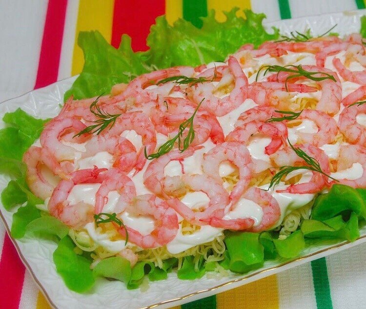 7. Майонез, соль - по вкусу. Способ приготовления: Салат "Комплимент" выкладывается слоями на большой плоской тарелке. Первый слой - листья салата. Второй слой - ананасы. Их необходимо порезать маленькими кубиками, смазать майонезом. Третий слой- куриные яйца. Отвариваем до готовности и мелко нарезаем. Слой смазываем майонезом. Четвертый слой - тертый сыр. Смазываем майонезом. Последним слоем выкладываем креветки. Креветки можно отварить, а можно обжарить на оливковом масле. Сбрызнуть лимонным соком. Красивый салат "Комплимент" готов! Приятного аппетита.