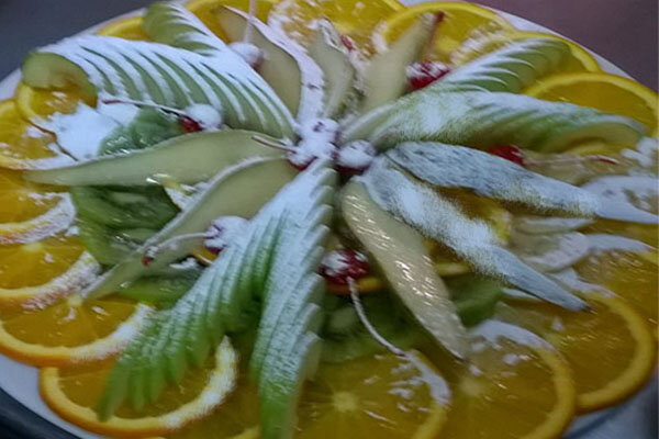 Новый год уже совсем близко, подготовка в самом разгаре. Предлагаю 5 лёгких рецептов, вегетарианских блюд. Советы от которых блюда становятся еще вкуснее. Фруктовая тарелка Для этого десерта понадобится: 1. Яблоки - 2 шт 2. Груша конференц - 2 шт 3. Киви - 2 шт 4. Вишня - 5 шт 5. Сахарная пудра - 50 г 6. Апельсины - 2 шт Нарезаем апельсины, киви - кружочками. Яблоко режем пополам, разрезанной стороной укладываем на доску и нарезаем поперек полукругами шириной 0,5 см. Грушу разрезаем на шесть долек вдоль плода. Собирать фруктовую тарелку начинаем с края, лесенкой. Первым укладываем апельсин, следующий ряд киви. Разрезанные половинки яблок складываем боком к центру и раздвигаем веером. Между яблок - груша острым кончиком к апельсину. Через сито посыпаем фрукты сахарной пудрой. Баклажаны Сладко кислое, в меру острое блюдо, эстетично выглядит, а вкусовые качества порадуют гостей. При выборе баклажанов тщательно осматривайте кожицу. Если на ней образовались коричневые пятна, такие баклаж