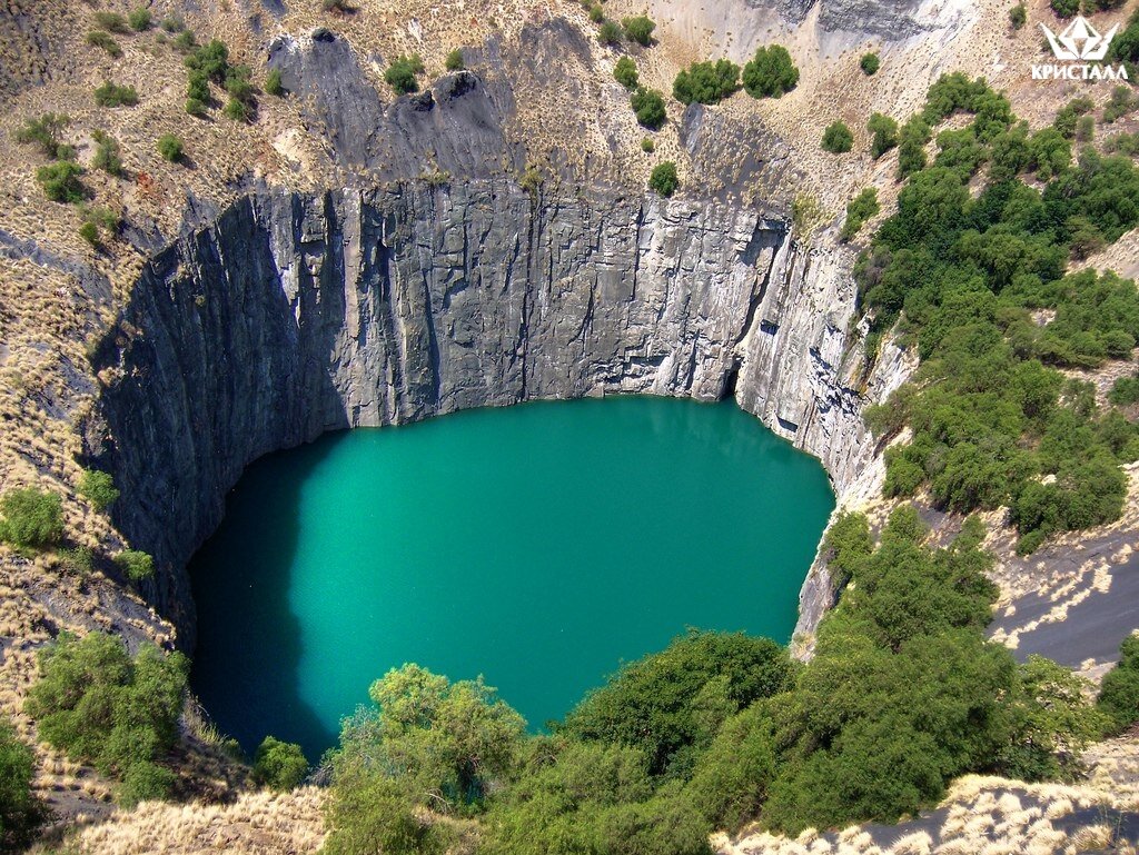 Несколько миллиардов лет назад в недрах земли произошёл прорыв магматических растворов и газов, в результате чего образовался уходящий вглубь колодец, верхняя часть которого напоминает расширяющийся раструб, а нижняя - узкую трубу. Внешне это чудо природы напоминает бокал или гигантскую воронку. После извержения в жерле этой воронки застыл туф серо-зеленого цвета, который и назвали кимберлитом - породой, состоящей из обломков залегающих в округе минералов. В состав кимберлита обычно входит оливин, огненно-красные гранаты и слоистые флогопиты – все эти минералы обязательно присутствуют в кимберлитовых массивах. Сам по себе кимберлит темного цвета, отливает синевой или зе