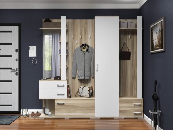 Подвесная модульная часть — идеально подходит для расположения предметов, которые необходимо забрать из квартиры: шапки, перчатки, зарядка. Поэтому эти предметы всегда будут находиться на видном месте, не будут «засорять» прихожую.