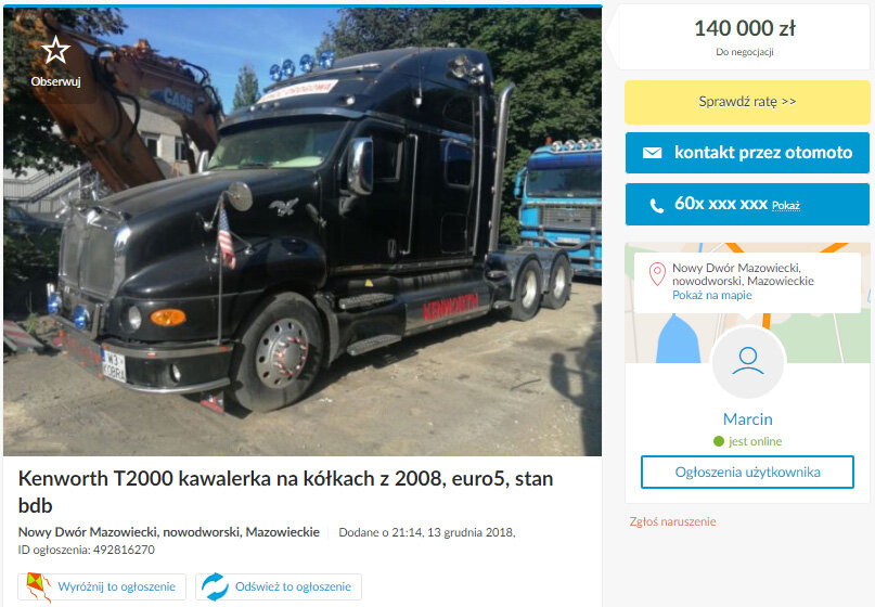 Очень много существует грузовиков, особенно в Европе, с удлинёнными спальниками, такие как SCANIA LongLine, которые я описывал ранее. Но теперь я покажу Вам особый автомобиль, который способен переплюнуть все эти Scania LongLine. Это Kenworth T2000, в который кто-то установил душ и туалет с полноразмерным унитазом. Этот автомобиль находится в Польше, и несколько дней назад был выставлен на продажу. Это настоящая квартира на колесах. Так как в описанной машине можно выспаться, вымыться и даже так сказать опустошить себя. Все это внутри оригинальной спальной кабины, длиной 187,5 см. Сам душ и расположенный в нем туалет заняли место за пассажирским сиденьем, предварительно предназначенное для различных типов шкафов. Фотография туалета, взятая из объявления: Сам автомобиль 2008 года, c пробегом всего 400 тыс.км., и 550-сильным 14-литровым двигателем Caterpillar. Что характерно для американских автомобилей, несмотря на огромные размеры и столь богатое оснащение кабины, вес чуть превышает 9