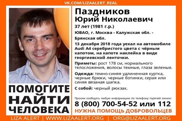 Паздников Юрий Николаевич, 37 лет, выехал их Москвы в Брянск 13 декабря на автомобиле “Ауди А4”. Машина серебристого цвета с черным капотом, на котором есть наклейка в виде георгиевской ленты. По дороге из столицы в наш город мужчина пропал. Поисковый отряд “Лиза Алерт” просит сообщать любую информацию о Юрие Паздникове по телефонам: 8-800-700-54-52 или 112. https://newsbryansk.ru/fn_424308.html
