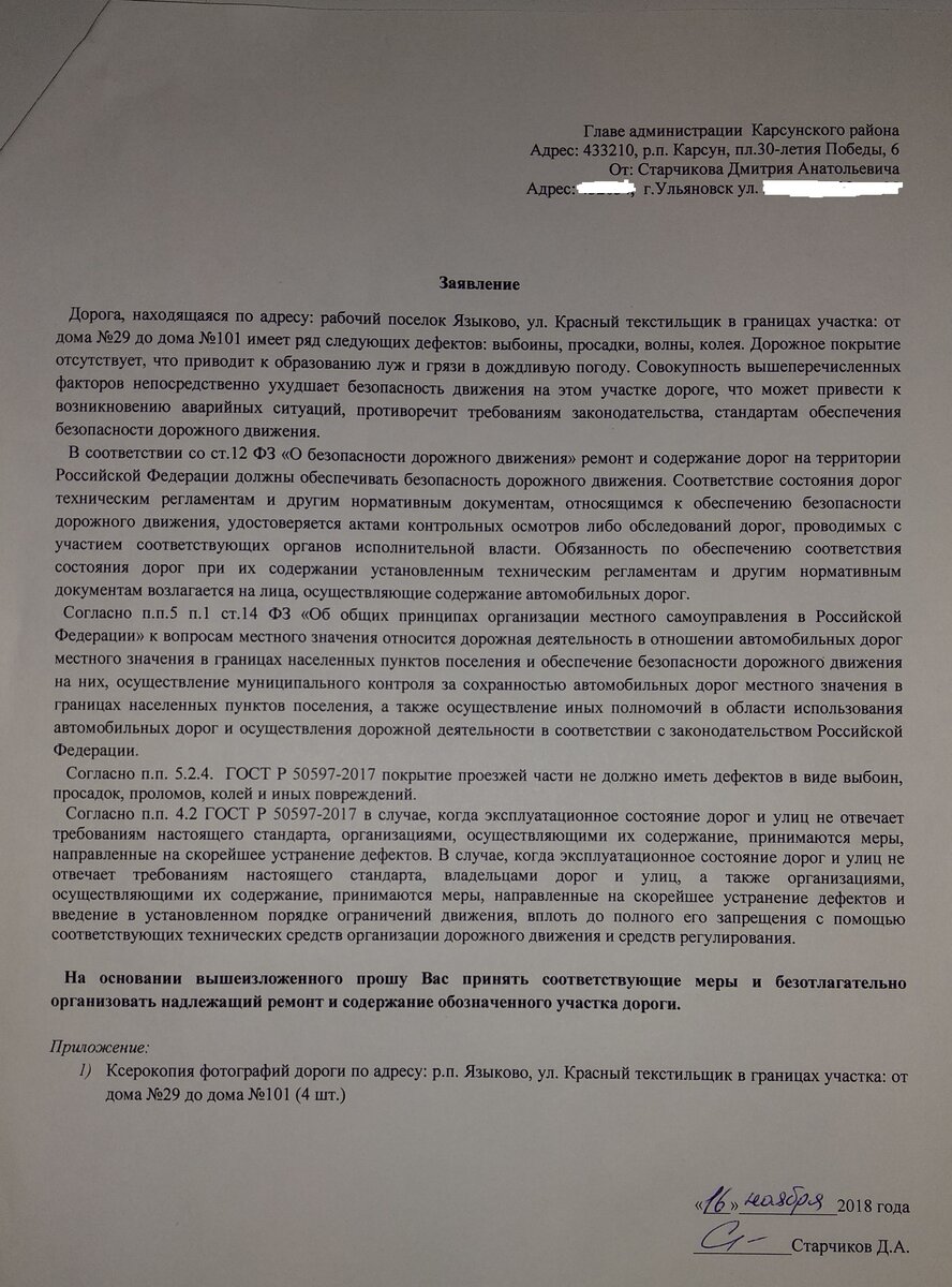 По просьбе местных жителей рабочего посёлка Языково Ульяновской области я обратился к главе администрации Карсунского района с требованием отремонтировать одну из центральных улиц посёлка - Красный текстильщик, облик которой не менялся со времен проживания здесь нашего земляка, знаменитого поэта Николая Языкова , то есть последние несколько веков. Ответ главы администрации оказался венцом юридической техники На требование о ремонте улицы господин Чубаров сперва зачем-то поспешил поделиться своими предыдущими асфальтобетонными достижениями, колоссальными цифрами и так далее. Как если бы человеку, которому срочно необходима медицинская помощь, врач в больнице стал рассказывать скольких пациентов уже удалось спасти до него - и больной на этом же месте чудесным образом выздоровел. Далее глава муниципального образования продемонстрировал свои познания в геология, указав на неведомую породу из соседнего карьера, которой засыпали дорогу. Если верить словам господина Чубарова - это опока (