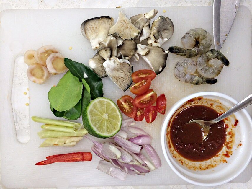 В субботу на нашей кулинарной вечеринке мы готовили очень простой том ям на курином бульоне. Обычно мы предварительно делаем пасту из сушеных перцев, но, кажется, самый примитивный вариант том яма был как раз на бульоне со свежими чили, тайскими травами, а пасту придумали уже позже для удобства. С перечной пастой вкус получается насыщеннее, а цвет том яма ярче. Но такой вариант не менее вкусный, и боле здоровый: все-таки паста пережаривается в большом количестве масла, и калорийность том яма на порцию получается под 400 ккал с кокосовым молоком, а такой вариант едва-ли дотянет до 250, если не меньше. Вот примерно такое количество продуктов нужно на 300 мл бульона, т.е. 1 среднюю порцию. Мы взяли куриный на этот раз. Сварили его из супового набора с луком, пучком кинзы вместе с корнями, галангалом и лемонграссом и процедили. Один большой перец чили смололи в ступке с чайной ложкой без горки пальмового сахара. Добавили столовую ложку рыбного соуса и половину столовой ложки тамариндов