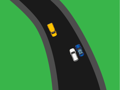 На данном изображении видно, что белый автомобиль движется без изменения полосы, а на полосе синего образуется препятствие в виде сужения проезжей части. Еще раз хочу обратить внимание на факт сужения проезжей части и на определение ее середины согласно Правил дорожного движения. Мнение, что полосы нужно считать от края проезжей части ошибочно. Для наглядности давайте сократим интервал сужения.
