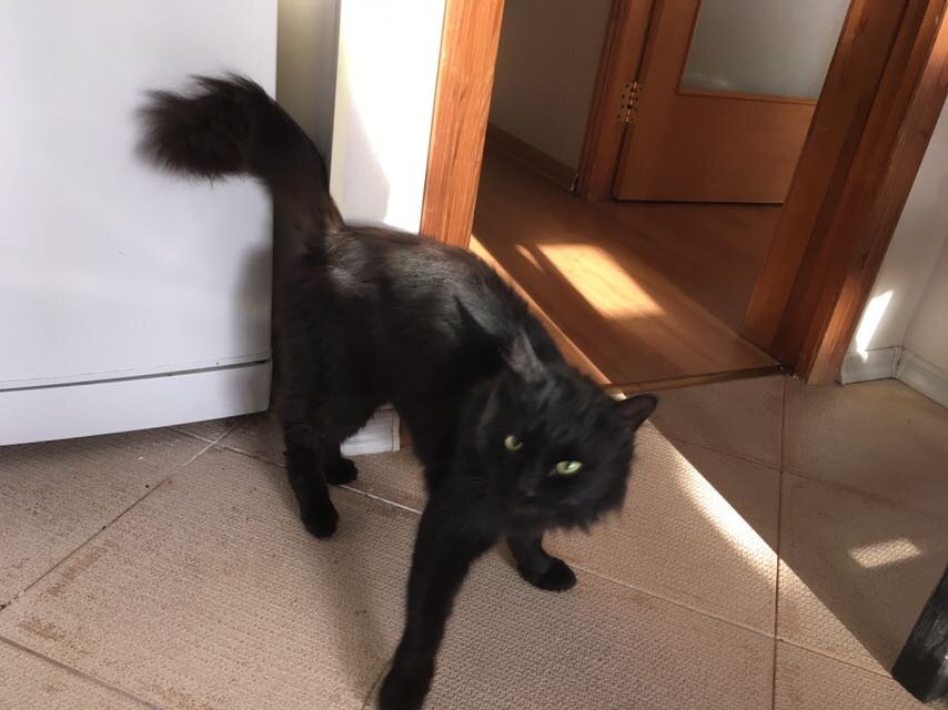 Кота по кличке Леший я нашла ещё котёнком. Когда я выходила с работы он спрыгнул на меня с дерева. Так и попал он ко мне домой. Но у Лешего есть привычка, которая с годами не меняется. Он любит меня пугать, ему нравиться моя реакция, и после сделанного действия он поднимает хвост, и гордо уходит в комнату. Привычка эта состоит в том, что кот прячется, под диван, за холодильник, за дверь, в общем везде где его не видно, ждёт пока я буду проходить и прыгает на меня. Сейчас я к этому конечно привыкла, но сначало я реально пугалась, подпрыгивала и кричала. На других людей он не прыгает, не знаю почему. Поэтому я и дала ему кличку Леший, хотя изначально звала его Кузя.