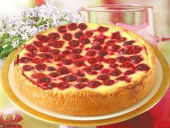 1 пакетик ванильного сахара Форма для запекания – диаметр 24 см. Приготовление: Подготавливаем все необходимые ингредиенты. Заранее размораживаем ягоды. Смазываем пергаментную бумагу сливочным маслом, застилаем дно формы для запекания. Также смазываем масло бока и немного присыпаем их мукой. Разогреваем духовой шкаф до 180 градусов. Смешиваем творог с сахаром, молоком и растительным маслом. Смешиваем муку и разрыхлитель, просеиваем их к творожную массу и замешиваем тесто. Готовое тесто скатываем шар. В отдельной посуде смешиваем сметану с сахар