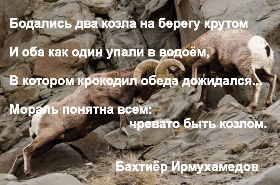 Бодались два козла на берегу крутом И оба как один упали в водоём, В котором крокодил обеда дожидался… Мораль понятна всем: чревато быть козлом. Бахтиёр Ирмухамедов