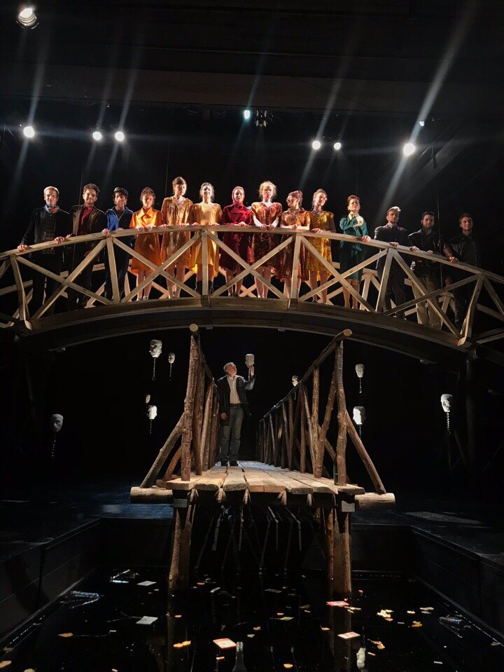 Женовач, кажется, по такому же принципу делит сценическое пространство. Филологини не спускаются к воде, где выпивают другие герои, они гуляют по мостику, поют романсы, читают стихотворения, рассуждают о высоком.