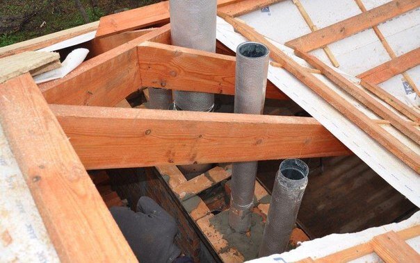 С помощью отвеса размечаются места крепления вертикальных стоек, принимающих часть нагрузки от стропил. Каждое из нарушенных стропил нужно подпирать в двух местах — выше и ниже вырезанного участка. При наличии кирпичного колодца лучше разгружать стропильную систему на него, заменив часть деревянных стоек укосами из угловой стали.