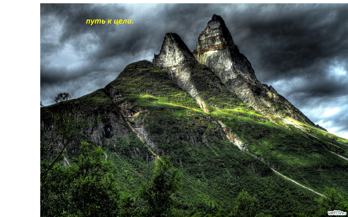 В жизни, очень часто, путь к какой-то вершине цели является трудным, очень сложно и страшно начать, тебя атакует страх, неуверенность, за частую они побеждают и люди сдаются. Чтобы этого не происходило НУЖНА ЦЕЛЬ, мотивация, желание, нужно видеть себя на вершине горы, не нужно думать о том какой путь предстоит пройти, и важно идти и не сдаваться, не останавливаться если вы уже начали. ИДИТЕ К ЦЕЛИ. ЧЕРЕЗ ВСЕ ПРИГРАДЫ, МЫ БОИМСЯ ОКАЗАТЬСЯ НЕ СЛАБЫМИ, А СИЛЬНЫМИ, СВЕТ ПУГАЕТ БОЛЬШЕ НАС ЧЕМ ТЬМА.