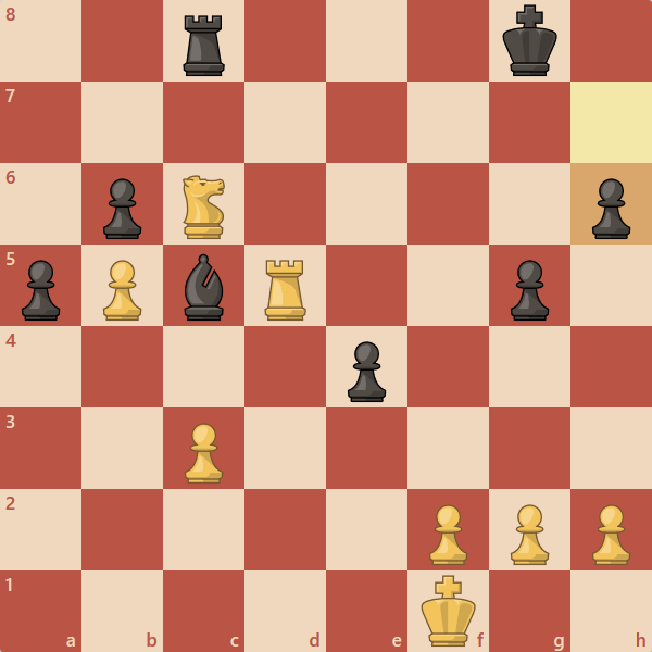 День добрый, друзья! Сегодня быстрая задачка на лучший ход... 1. ..h6 Ход белых! Решение Все в, принципе, очевидно... Сначала уничтожаем защиту: 1. Лxc5 bxc5 Затем делаем двойной удар: 2. Кe7+ Крh7 И забираем Ладью: 3. Кxc8