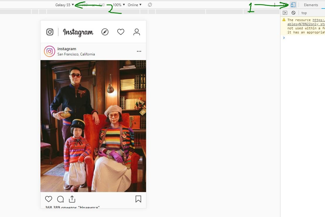 Наверняка вы хотите редактировать видео или фото на компе, а потом закинуть их в Инстаграм. Для этого нужно проделать лишние манипуляции, к примеру, с компа закинуть редактированное фото на телефон. а с телефона в Инсту. Очень много лишних действий. Конечно есть моментальный быстрый способ это установить Тлеграмм на ПК и телефон и передавать различные форматы файлов с ПК на Мобилу. Но тема будет другой. Я покажу, как именно закинуть фото или видео в Инстаграмм с ПК. Погнали! Шаг 1. Откройте Инстаграм и авторизуйтесь в аккаунте. Далее нажмите сочетание кнопок Ctrl + Shift + I. Шаг 2. Далее у вас появится боковая панель, в некоторых браузерах она может быть снизу, в этой панели найдите иконку на переключения мобильный вид, и выберите любое устройство. В моем случае Galaxy S5. Шаг 3. Как только выбрали устройство, нажмите F5, чтобы обновить страницу. Вы в углу увидите значок для загрузки фото. Вообщем вы получаете полноценный мобильный Инстаграм в браузере. Вступай в фан-группу Вконтакте