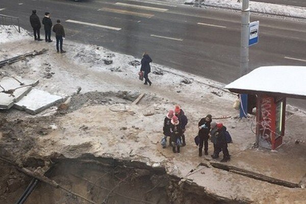 Фотографии котлована сегодня появились в социальных сетях. Как запечатлено на фото, дети с ранцами, по всей вероятности, идущие из школы, стоят на самом краю огромного котлована.