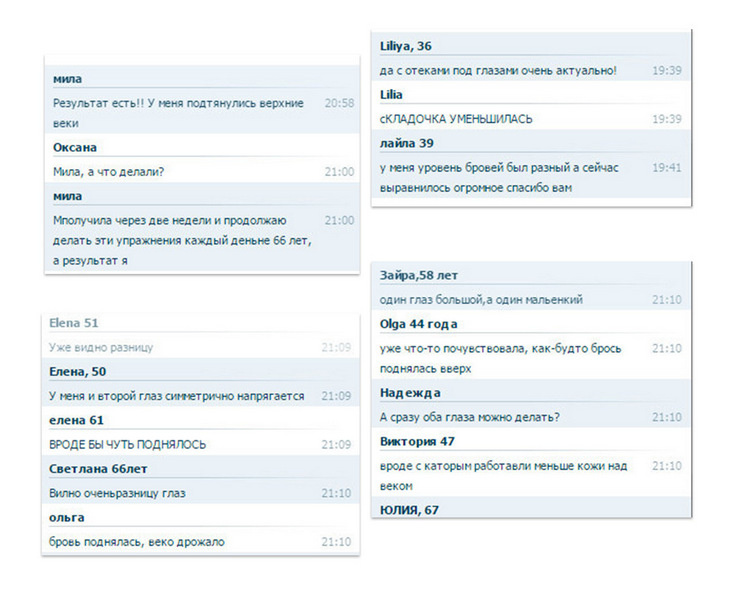 Вот скрины с впечатлениями, ощущениями и результатами участниц открытого практического занятия, на котором мы выучили одно простое упражнение по подтяжке верхнего века. И заметьте (!) это всего лишь после однократного выполнения - участницы впервые освоили упражнение и проделали его на занятии.