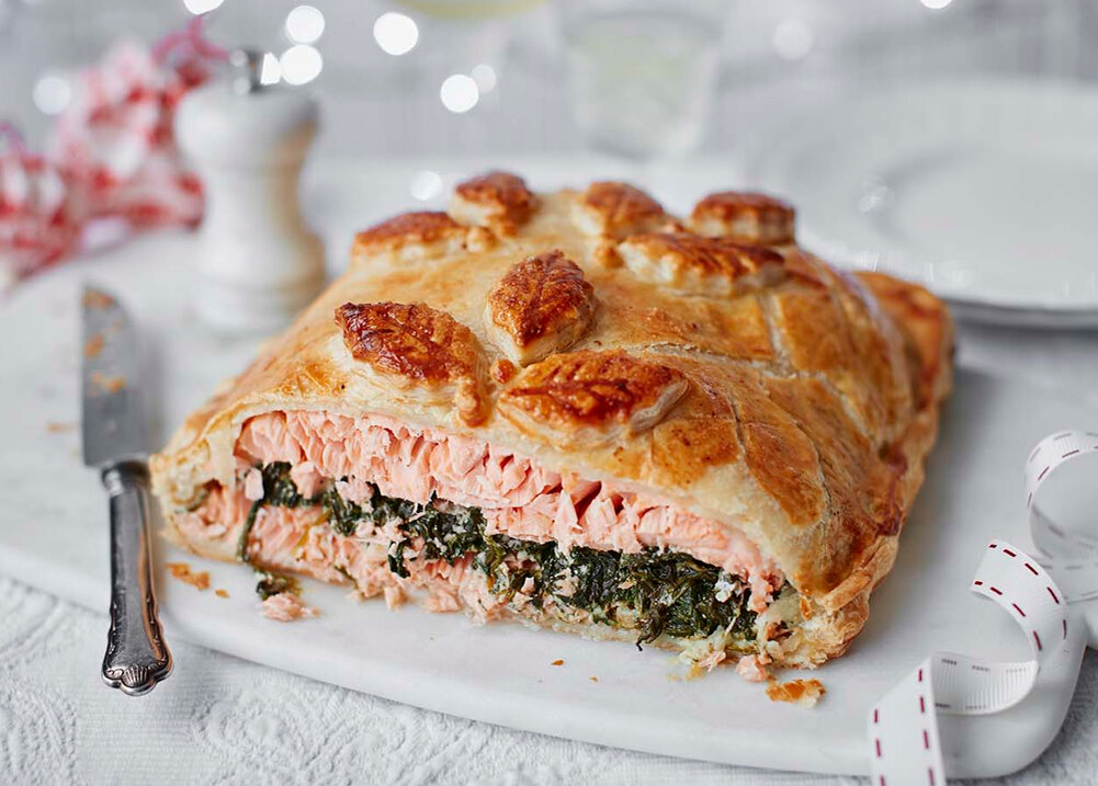 Яйцо куриное 1 шт. Разогреваем духовку до 180 °C. Используя острый нож, снимаем кожицу и удаляем кости у рыбы. У Вас должны получиться два филе. 5 минут пассируйте шпинат со сливочным маслом, приправой для рыбы и мускатным орехом, после чего слейте всю жидкость и смешайте шпинат со сметаной и лимонным соком. Раскатайте тесто и разделите его на две части, оставив полоску теста для украшения. Присыпьте противень с пекарской бумагой щепоткой муки. Выложите на одну половинку теста филе, затем слой шпината, а поверх – второе филе. Смажьте края теста яйцом и накройте второй половиной теста, прижав по краям вилкой. Сделайте из оставшейся полоски теста листики, звездочки или любые другие фигурки и украсьте верхушку пирога. Поместите пирог в холодильник на 20 минут ДО выпечки. Отправьте пирог в предварительно разогретый духовой шкаф и запекайте 30-35 минут до золотистой корочки.