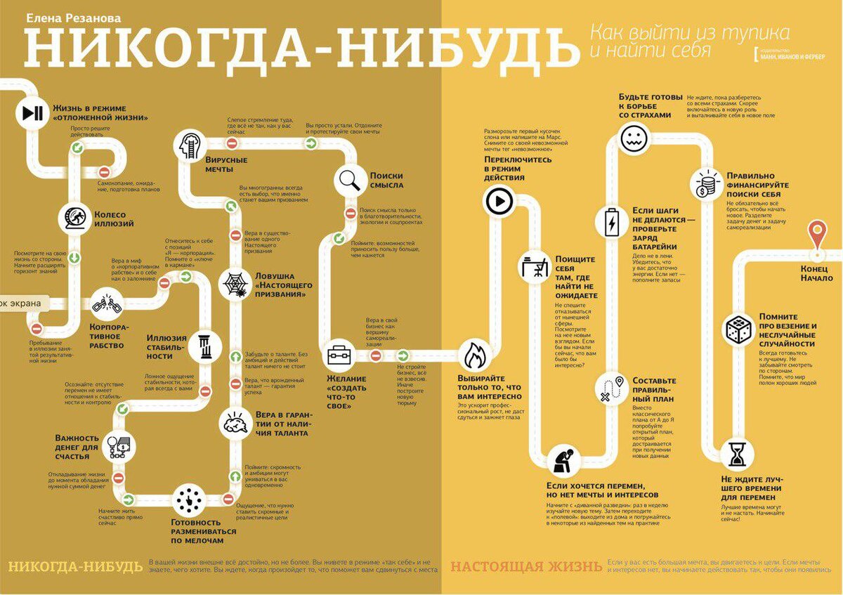 Последнее время мне очень заходит во время бега слушать аудиокниги. Сбылась мечта детства: читать и идти 🙂 в смысле слушать и бежать. Вчера закончилась «Никогда-нибудь» Елены Резановой, о ней и пойдёт речь. Кому: тем, кто профессионал, но немного или сильно подзадолбался на своём рабочем месте Зачем: Елена даёт вполне практичные советы как выйти из замкнутого круга: «я хочу чего-то другого, но не хочу терять в деньгах, а ещё у меня дети, ипотека и прочие обязательства». Интересное: зачастую желание финансового директора об открытии маленькой кофейни на испанском побережье — это вирусная идея, вызванная желанием оказаться подальше от собственной жизни и работы. Совсем не факт, что это то, что действительно нужно. Вполне дельный совет искать что-то иное не в противоположной стороне ваших профессиональных навыков и опыта, а где-то совсем рядом. Хорошая аналогия: работа — это как человек рядом, не факт что один и не факт, что на всю жизнь 🙂 Понравилось ли мне? Скорее да, чем нет, но мес