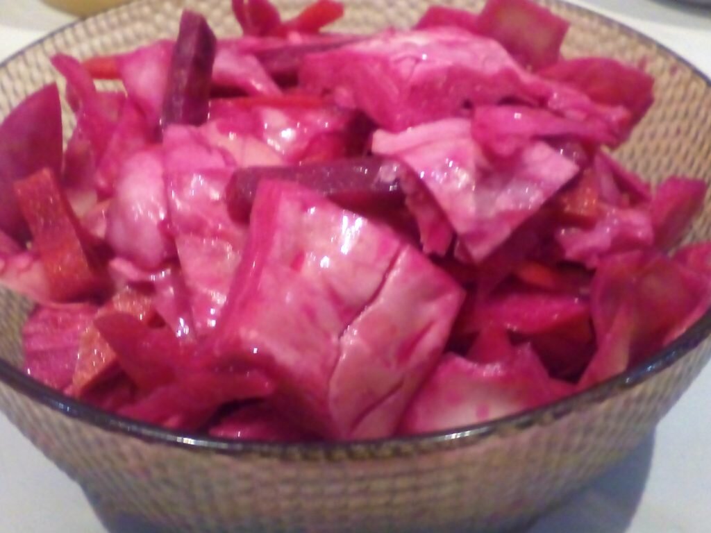 Капуста - 2 кг, морковь - 2 шт, свекла - 1 шт(большая), чеснок - 1 или 2 зубца. Режем капусту шашками, морковь, свеклу небольшими кусочками, чеснок, все перемешать, уложить в тару.