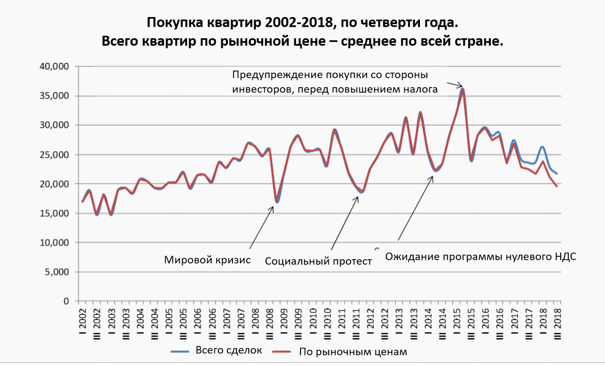 Эксперт International Investment по вопросам ипотечного кредитования в Израиле и семейной экономике Алекс Соркин проанализировал ситуацию на рынке и выявил новый тренд. Совсем недавно вышел новый отчет главного экономиста страны, который на мой взгляд показывает некую тенденцию, которая происходит на рынке недвижимости Израиля. В этой статье я попытаюсь проанализировать основные аспекты отчета. Начнем с основной картины которая представлена на графике ниже. На графике видно, что за исключением временных шумов (таких как мировой кризис, социальный протест и регулирование государства), количество сделок недвижимости не опускалось ниже 25,000 сделок начиная с 2007 года. Так было вплоть до 2018 года в третьей четверти которого количество сделок опустилось даже ниже 20,000 сделок если не учитывать искусственный спрос в рамках программы "Цена для новосела". Если рассматривать более детально и разделить между сделками вторичного и первичного жилья, картина выглядит более ясной.