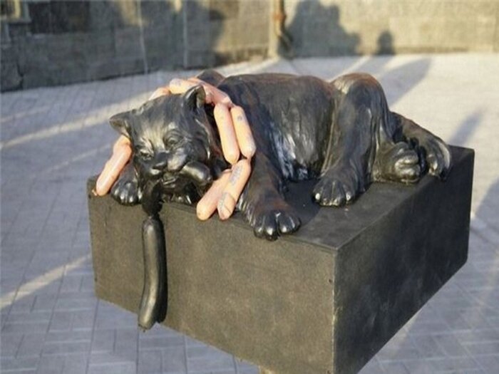 Говорящий памятник коту с сосисками в Анжеро-Судженске. Томский скульптор и художник Олег Кислицкий изготовил для Анжеро-Судженского мясокомбината (Кемеровская область) две скульптуры – “Корову Маню” и “Говорящего кота”. “Это кот-сторож размером 60 на 60 см. Этакий объевшийся, жирный кот, из пасти которого свисают сосиски. Если потрогать одну из сосисок, то кот произнесет какую-нибудь фразу. Варианты фраз разные. Например: “Лучшая рыба – это колбаса” или “Сорок один, ем один”, – рассказал скульптор. Адрес: Россия, Кемеровская обл., Кузбасс, Анжеро-Судженский мясокомбинат