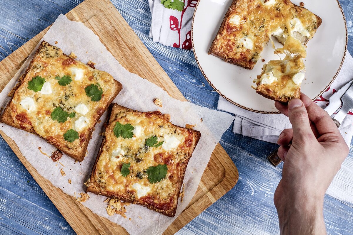 Тосты а-ля «Пицца 4 сыра» Заказывать по утрам пиццу — долго и хлопотно. А вот тосты, которые не отличить от любимой пиццы, это выход. Они и готовятся быстрее, и по вкусу не уступают своей большой подруге. Как насчет завтрака: благородного, как голубой сыр, пикантного, как чеддер, и итальянского, как моцарелла? Хлеб тостовый 4 шт