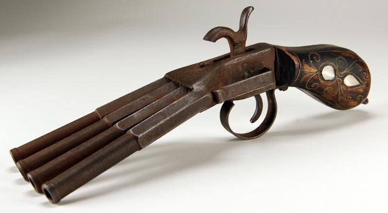 Кроме широкого распространения в армиях и силовых структурах, пистолеты и револьверы всегда носили и некую «гражданскую» направленность – для самообороны. Как правило, это были небольшие механизмы, «карманные», малогабаритные. Но были в истории и исключения. XVII–XVIII века распространили в мире такой вид пистолетов, как «залповый». Историки говорят, что такое оружие использовалось и раньше – охранниками в тюрьмах, и матросами на кораблях при нападении пиратов. Однако именно с конца XVII века и вплоть до начала XIX века, когда Европу и Америку заполнила волна бунтов и революций, породившие распространение грабителей и разбойников всех мастей, в подобных пистолетах возникла особая необходимость. Возможность выстрелить залпом из нескольких стволов, когда времени прицелиться особо не было, вот что давали подобные пистолеты даже не особо меткому человеку, спасавшему свое имущество, здоровье и жизнь. Изготавливались и шести- и семиствольные кремневые пистолеты с ударным механизмом, но наи