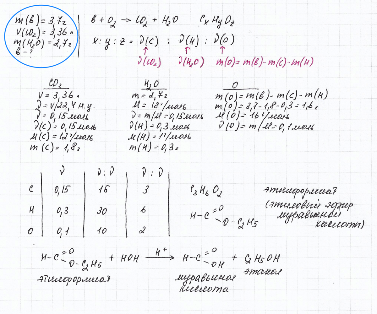 При сгорании 3,7 г органического вещества выделилось 3,36 л углекислого газа и 2,7 г воды. Вещество подвергается гидролизу в кислой среде, один из продуктов гидролиза способен реагировать с гидроксидом меди (II) с образованием кирпично-красного осадка.