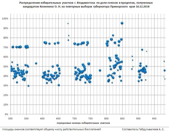 Но ряд участков значительно выбился из общей статистики. Как пишут «Ведомости», по Ленинской территориальной избирательной комиссии (ТИК) Владивостока на 39 участках Кожемяко получил от 30 до 50%, на 15 – более 70% и только на пяти – от 50,1 до 54%. В Первомайской ТИК 36 участков дали ему менее 50%, 20 – более 70% и лишь два – между этими цифрами. А по Первореченской ТИК на 39 участках Кожемяко набрал меньше 50%, на девяти – больше 70% и на трех – 50,1–70%. Именно на этих трех ТИК зарегистрировано наибольшее число избирателей.