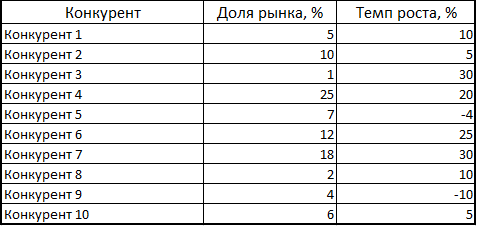 Определите ваших главных конкурентов и оцените их долю рынка (отношение объема проданных товаров конкурента поделить на общий объем проданных товаров на рынке за тот же период). Рассчитайте темпы роста продаж конкурентов. Внесите данные в таблицу и постройте карту, как на рисунке.