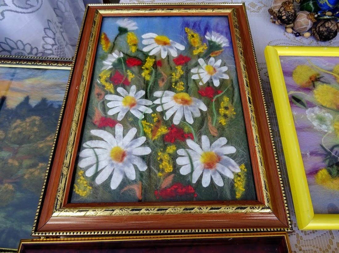 Валяние из шерсти было популярно много веков назад, но и сегодня эта техника весьма распространена среди рукодельниц. В последние годы часто встречаю всевозможные изделия и картины, выполненные в технике фелтинга. Современное валяние отличается не только богатством красок, но и оригинальными сюжетами. Недавно вновь была на выставке народных промыслов и сфотографировала массу интересных работ. Посмотрите на эти прелестные ромашки, они словно живые. Все картины были под стеклом. Ведь шерсть не любит даже малейшего дуновения ветра, когда любая картина может потерять изначальный вид. По одной из версий считается, что этот вид рукоделия пришёл к нам вместе с монголо-татарским игом. Тогда в основном изготавливали сукно и войлок, используемый в хозяйстве. В таких сапожках зимой будет не только тепло и комфортно, но и очень стильно :-) В давние времена шерстью утепляли дома, а малыши предпочитали играться именно с валяными игрушками, в которые могли прятать секреты. Мне понравились и вот такие