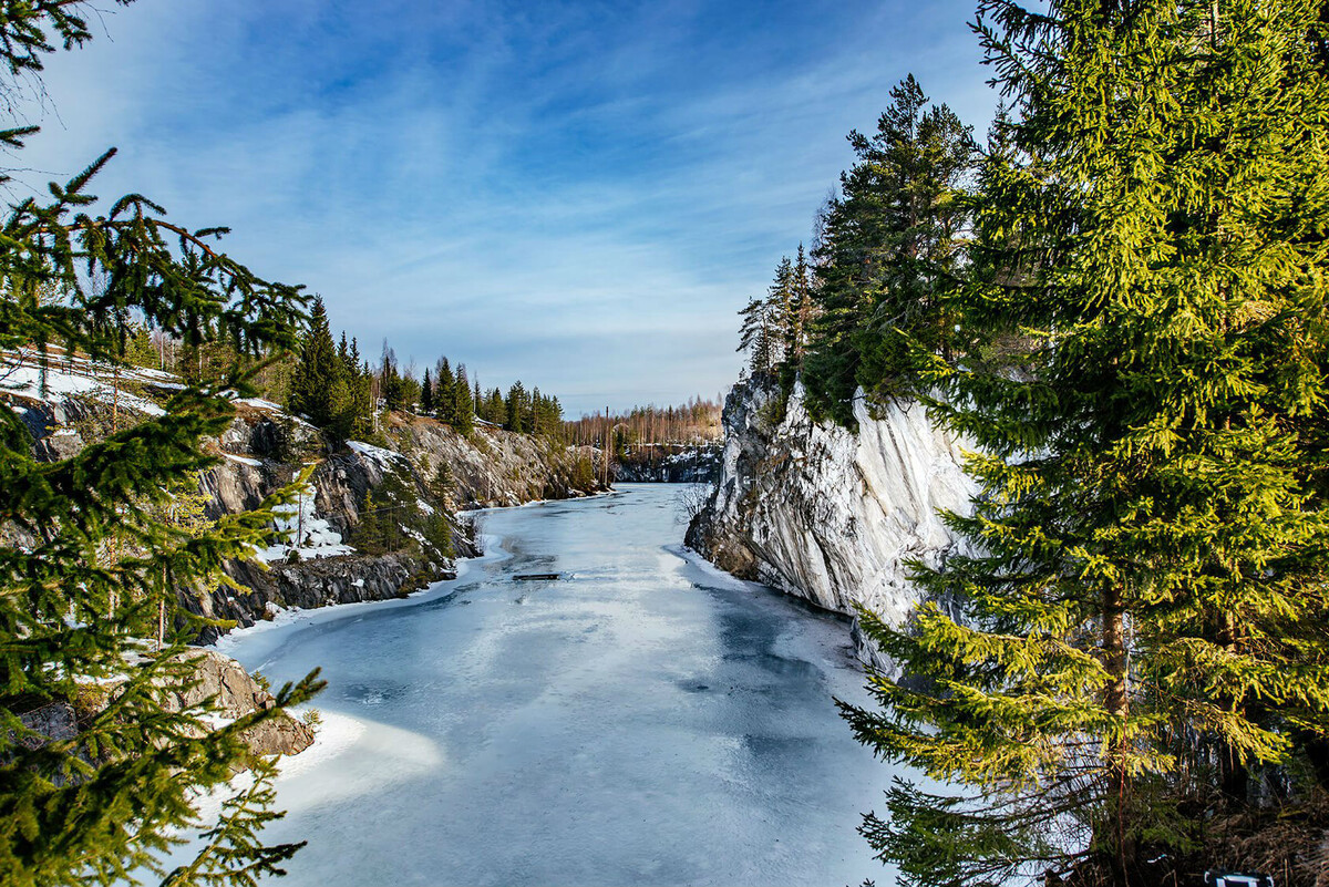 Еще 80 лет назад эта территория принадлежала Финляндии. И если бы не советско-финская война 1939-1940 годов, побывать здесь можно было бы только при наличии Шенгенской визы. Но, благодаря мирному договору между СССР и Финляндией (1940 год) мы можем посещать это потрясающее место без каких-либо ограничений. Теперь мы называем этот регион Карелия. Республика расположена на северо-западе России и граничит на западе с Финляндией. Наверняка вы слышали, насколько много в Карелии красивых мест, но до сих пор не побывали там. Настоящая жемчужина этого уголка России - мраморный каньон, расположенный в горном парке "Рускеала", вблизи одноименного поселка. На самом деле, это бывший карьер, из которого добывали мрамор. Позже, после окончания добычи, карьер наполнился грунтовыми водами и теперь это одна из главных достопримечательностей Карелии. За счет белого цвета мраморного дна, прозрачность воды достигает 18 метров. Лучше всего ехать сюда летом. Именно в это время года в Карелии наиболее ко