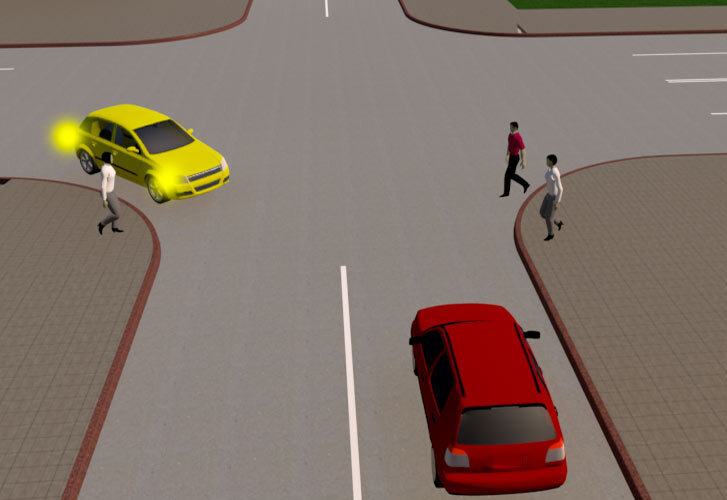 Как вы заметили с одной стороны желтый автомобиль должен уступить, с другой стороны пешеходы ему же не должны создавать помех. Получается равнозначное требование.