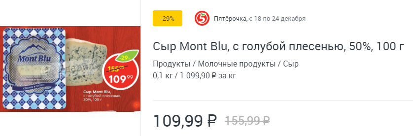 Сыр Mont Blu, с голубой плесенью. Многие боятся покупать подобные сыры, а зря! Стоит попробовать, тем более по скидке.
