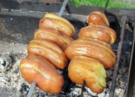 Картофель хорошо моем, режем пластинами. Сало режем кусочками. Нанизываем на шампур чередуя, картофель - сало -картофель.