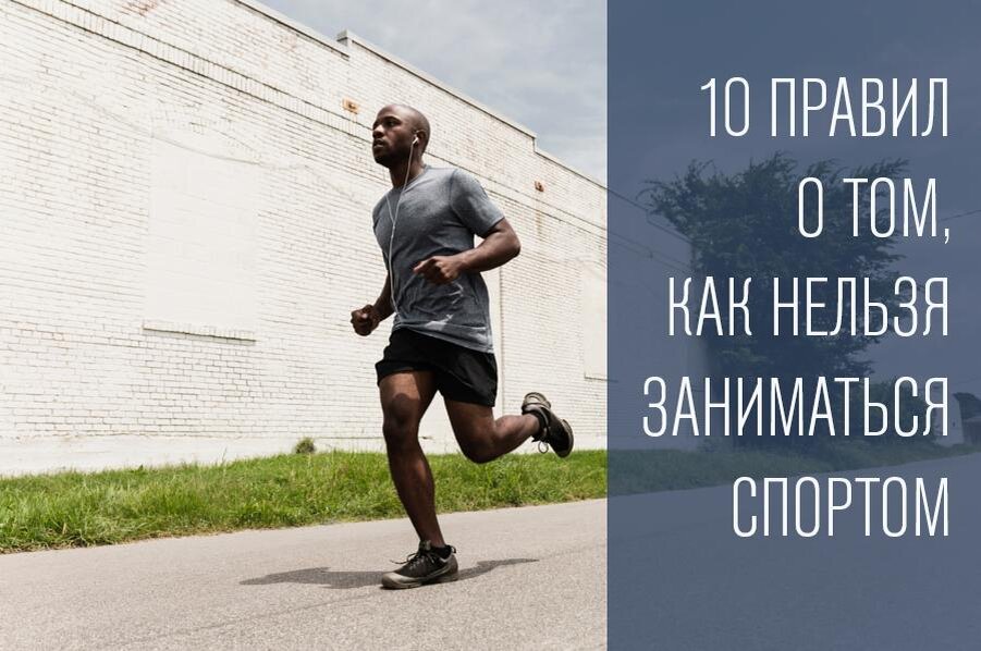 1. Нельзя находится на тренировках без спортивной обуви. Если вы будите в носках, в спортивной обуви с тонкой подошвой или совсем босыми это навредит сосудам и перегрузит позвоночник. 2. Запрещено использовать антиперспирант. Эти гигиенические средства, препятствуют выведению шлаков из организма при помощи потоотделения, в следствии физических нагрузок. 3. Спортивная форма является важной частью спортивных тренировок. Одежда должна быть удобной, иначе тренироваться будет не комфортно. 4. Бег по асфальтированной дороге. Асфальт не поглощает толчки, что может повлечь за собой травмы позвонков и плоскостопие. Беговая дорожка либо дорога из земли является лучшим местом для бега. 5. Не слушайте музыку через наушники во время тренировки. Исследователи утверждают, что спорт в сочетании с громкой музыкой зачастую влечёт за собой потерю слуха. 6. Усталость и спорт не совместимы. Если организм устал, то тренировки нужно отложить, так как кроме стресса вы не добьётесь никакого результата. 7. Не н