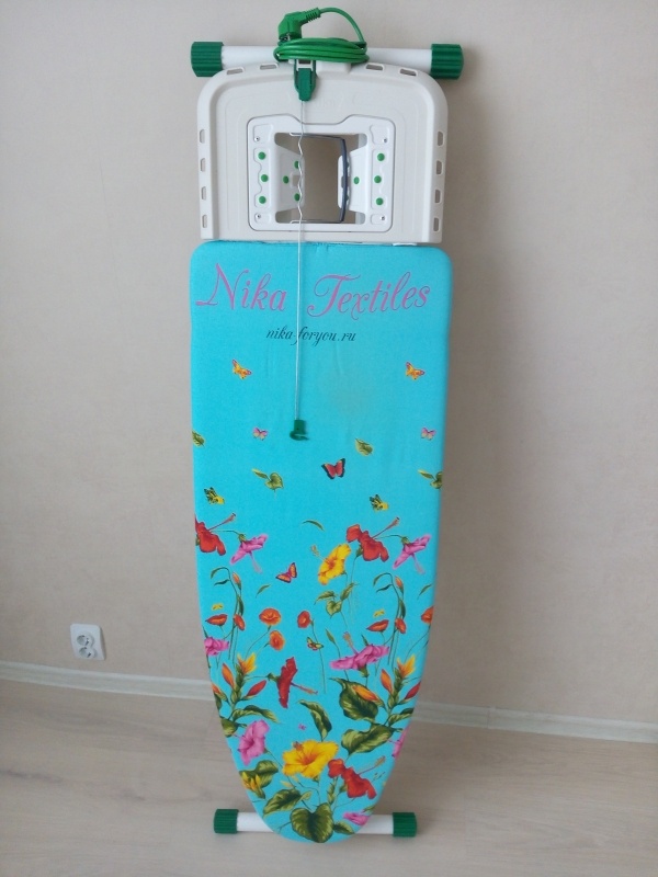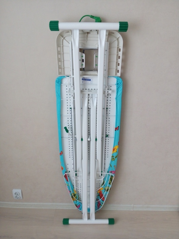 Всем привет, сегодня я вам расскажу про гладильную доску. Первоначально была куплена самая простая гладильная доска, меня она устраивала. Она была небольшая, легкая, удобная и недорогая. Но со временем она рассохлась, пришлось заменить чехол и через пол года сменить саму поверхность. Куплена была обычная доска и вырезана лобзиком форма гладильной доски. После взяли строительный степлер и обшили куском ткани. После чего, к доске были прикручены ножки от старой доски. Этот вариант был лучше, чем первоначальный, сама рабочая поверхность была ровная, широкая и очень удобная. Но ножки были узкими, доска стояла не так устойчиво и высота рабочей поверхности регулировалась в 2 положениях. Такой вариант нам подходил, но как всегда хочется больше, поэтому была сделана покупка новой гладильной доски. Упаковка, комплект поставки, внешний вид. Привезя доску домой, я еще раз осмотрел ее. Гладильная доска упакована в прозрачную пленку. Рассмотреть ее комплектацию и состояние у вас не