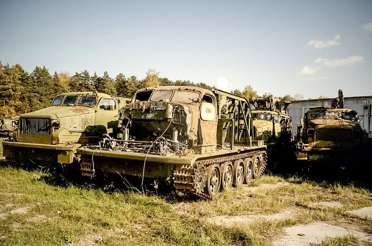 В рядах нашей славной армии есть не только боевая техника, но и техника, которая помогает копать и строить. И сегодня в нашем отчете речь пойдет именно о ней. На эту стоянку инженерной техники мы наткнулись совершенно случайно. В самой части еще немного теплилась жизнь в виде лохматой собаки и старенького сторожа. Не мудрено, вся эта техника "на списании" и очень скоро отправится на "переплавку", поэтому, особого присмотра за ней и не требуются. Мы аккуратно обошли стороной "зону внимания" сторожа и зашли со стороны леса. Стоянка оказалась не такой уж и большой. Около сотни машин, хотя может что-то и стоит в ангарах, но они были закрыты, а туда где закрыто мы не лезем. Давайте рассмотрим подробнее, что же за машины тут стоят. Например, на фото выше стоят машины, которые нужны для строительства переправ через водоемы, а на фото ниже инженерная машина, предназначение которой заключается в том, чтобы "ровнять грунт" и перевозить- перетаскивать тяжелые грузы. Кстати, зачем этот огромный