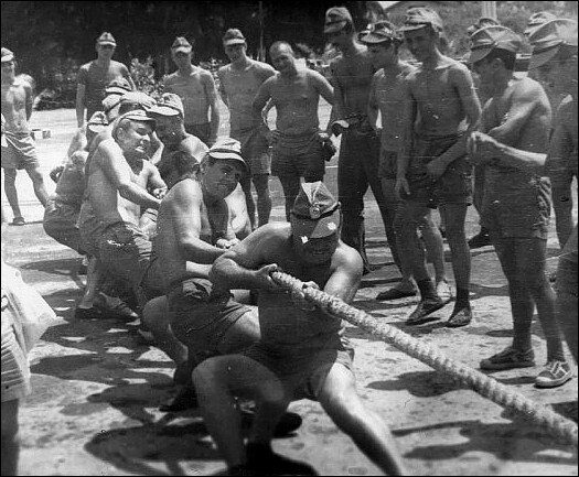 На кораблях же всё было практически на уровне любительщины, а во время боевых служб внимание обычно направлено на другие цели. Хотя при всяком удобном случае всё же проводились какие-либо спортивные мероприятия. Всегда можно было поболтаться на установленной в удобном месте перекладине, потягать гири, поиграть в волейбол, если место позволяло. Перетягивание каната - одно из самых непритязательных видов соревнований, но сколько азарта обычно вызывает!
