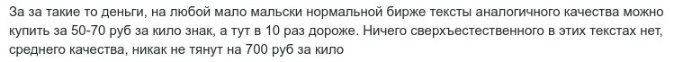 Ещё не забыли мою историю про двух комментаторов? Реплика защитника кажется мне более неправильной, чем обвинение в завышенных ценах. Копирайтерам можно много платить не потому, что они ещё и сеошники.