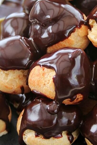 Все, кто их пробовал, отмечают, что эти профитроли вкуснее покупных. Хотя ничего сложного в рецепте нет. Можете сами убедиться. Начнем с теста. Нам понадобятся 2 стакана (250мл) воды 1ч л сахара 150 г масла сливочного 2 стакана муки 6-7 яиц Воду ставим на огонь. Добавляем сахар и масло. Доводим до кипения. Снимаем с огня и вводим муку, тщательно вымешиваем ложкой, чтобы не образовалось комочков. Нужно немного остудить. Когда рукам не будет горячо, по одному вводим в тесто яйца, размешивая до однородности. Консистенция должна получиться такой, чтобы не растекалась и в тоже время легко выдавливалась из кондитерского мешка или шприца (от этого и зависит количество яиц). В данном варианте я выкладываю тесто ложками, но масса должна быть такой же. На противень выстилаем пергаментную бумагу, которую можно смазать маслом. С помощью насадки или двумя десертными (чайными) ложками, перемещая комок из одной в другую, тем самым формируя шарик, выкладываем тесто на противень. Не забываем отступать
