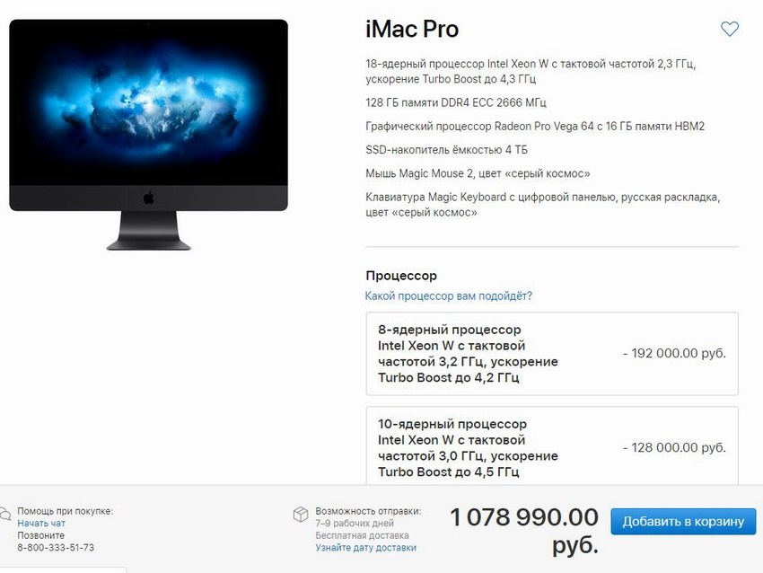 Взгляните на скриншот официального сайта – на нем вы увидите компьютер iMac Pro в почти максимальной комплектации, которая уже стоит больше 1 миллиона рублей. Все верно, у покупателей теперь есть выбор – купить неплохой автомобиль или настольный ПК от Apple. К нему можно докупить аксессуаров и программ еще на 100 000 рублей, чтобы было совсем хорошо. Пока что это самая дорогая позиция в магазине Яблочной империи, но, напомним, 1 января НДС повысится до 20 процентов, а после открытия торгов рубль в очередной раз спикирует вниз, что гарантированно вызовет еще больший рост цен.