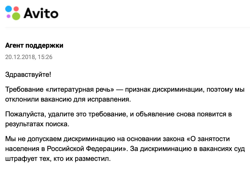 Публиковал я сегодня на Авито объявление о поиске сотрудника. И никак оно у меня модерацию не проходило - мол, уберите дискриминацию. Ну ладно, с тяжким сердцем убрал фразу о том, что требуется блондинка не старше 22 лет и с размером не меньше 3... Но остальное-то в порядке. Ума не приложу, что не так. В итоге я превысил лимит отправок на модерацию, и объявление заблокировали. Пришлось писать в саппорт, и ответ поверг меня в шок и трепет. Оказывается, дискриминация-то у меня таки была. Оголтелая. По литературному признаку. Не могу я, понимаете ли, требовать от работников литературной речи. Пусть, нах, выражовываются как умеют, матерятся и всё такое - не имею я права запрещать. - Я им говорю: не ложьте! А они всё ложут и ложут... (с)