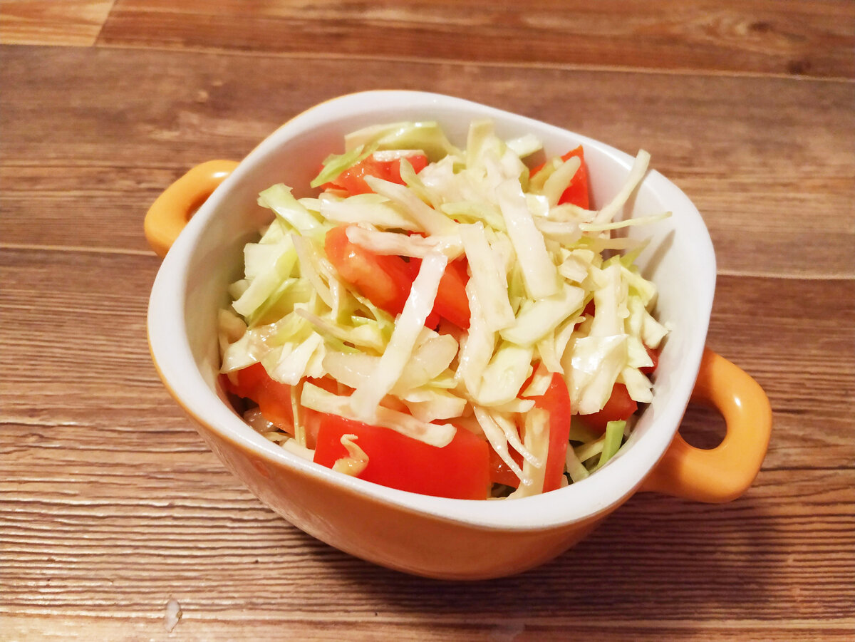 Остренькое любят многие. А этот простой овощной салат можно готовить каждый день. Ведь времени на его приготовление уходит всего-то несколько минут. Ингредиенты: Капуста - половина небольшого кочана; Помидорки - пара штучек; Лук - половина головки; Огурец - 1 штучка; Болгарский перчик - 1 штучка; Соль -по вкусу; Сахар - по желанию и вкусу; Уксус 9% - полторы столовых ложки; Перец - по вкусу; Масло растительное или оливковое - пара столовых ложек. Процесс приготовления: 1. Капуста нашинковать соломкой и помять руками. 2. Помидорки нарезать кубиками или полосками. 3. Порезать соломкой огурчик. 4. Болгарский перец порезать кубиками или соломкой. 5. Переложить все в одну посуду. Подсолить и добавить по вкусу сахара. Можно насыпать перчика. 6. Полить уксусом. 7. Добавить масла. И хорошо перемешать салатик. Подавать салат к мясу или рыбе. Bon appetit!